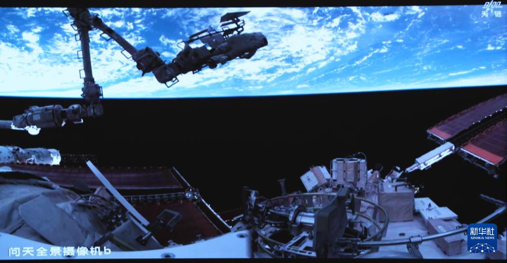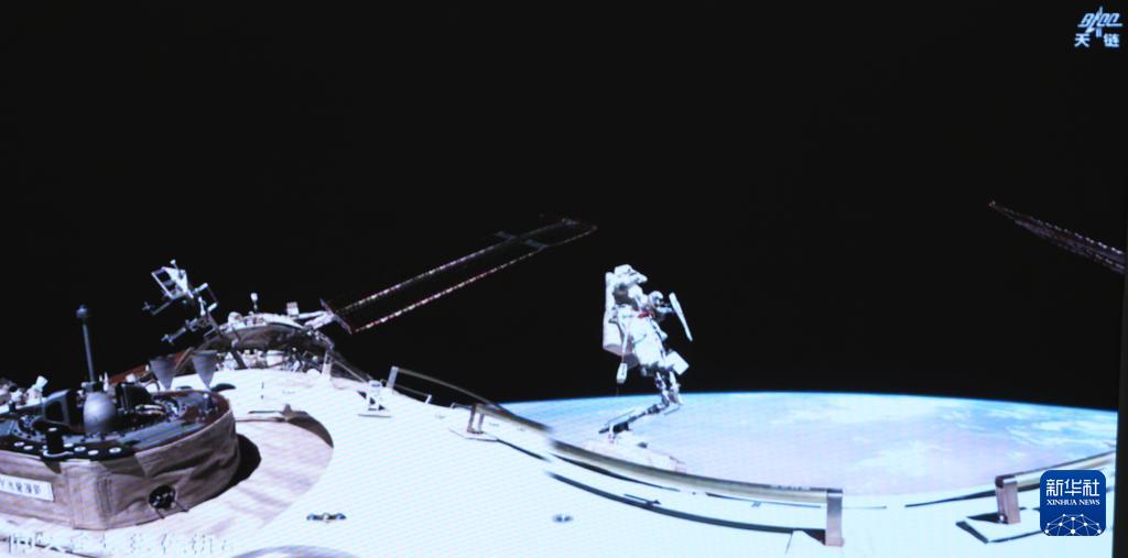 這是8月15日在北京航天飛行控制中心屏幕上拍攝的神舟二十號乘組航天員陳冬在艙外工作的畫面。新華社記者 厲彥辰 攝