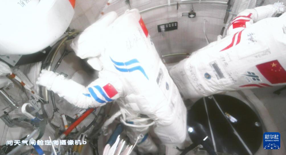 這是8月15日在北京航天飛行控制中心屏幕上拍攝的神舟二十號乘組航天員陳冬(左)與王杰準(zhǔn)備出艙的畫面。新華社記者 厲彥辰 攝