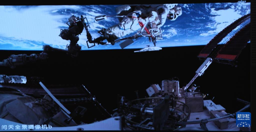 這是8月15日在北京航天飛行控制中心屏幕上拍攝的神舟二十號乘組航天員陳冬(左)與王杰在艙外工作的畫面(視頻截圖)。新華社記者 殷家捷 攝