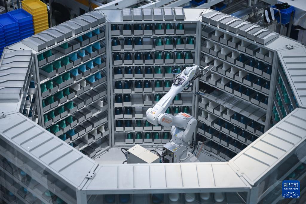 這是8月19日在福建莆田雙馳科技定制工廠店智能工廠拍攝的一臺高效運轉的機械臂。
