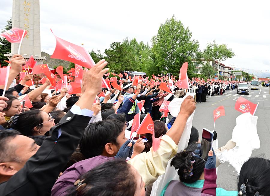 人群如潮水涌到道路兩旁,揮舞紅旗、手捧哈達(dá),高呼“扎西德勒”,聲聲祝福是“感恩總書(shū)記、感恩黨中央”的由衷表達(dá)。習(xí)近平總書(shū)記拉開(kāi)車窗,微笑著向人群揮手致意。