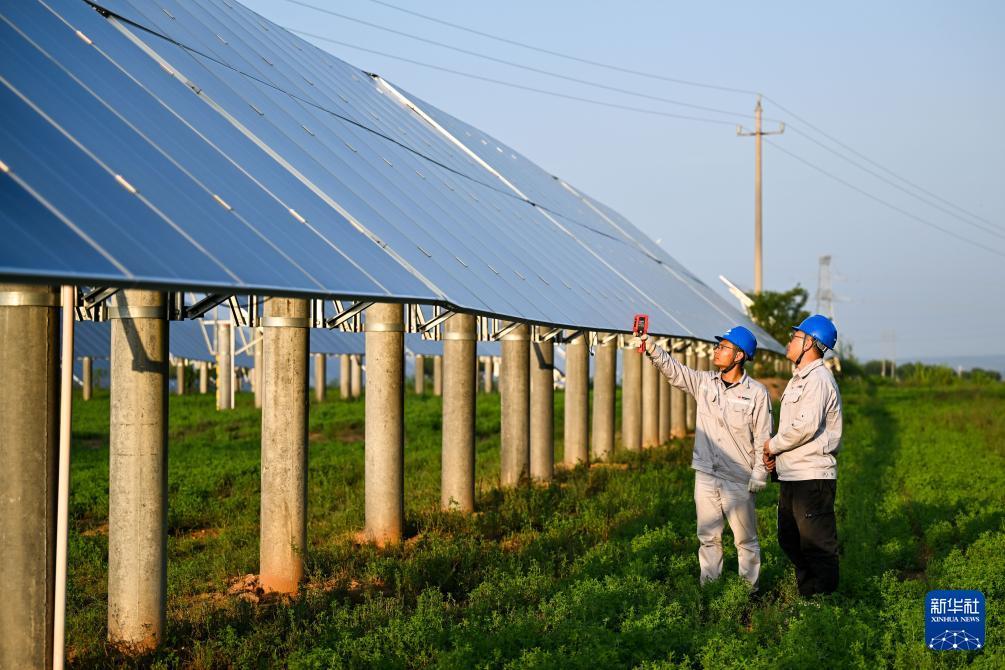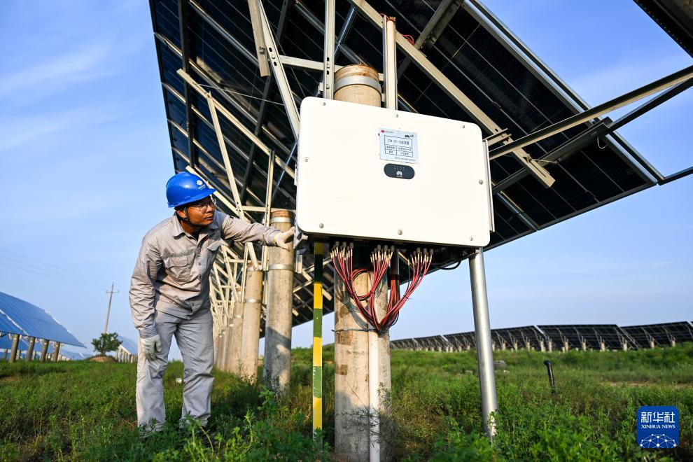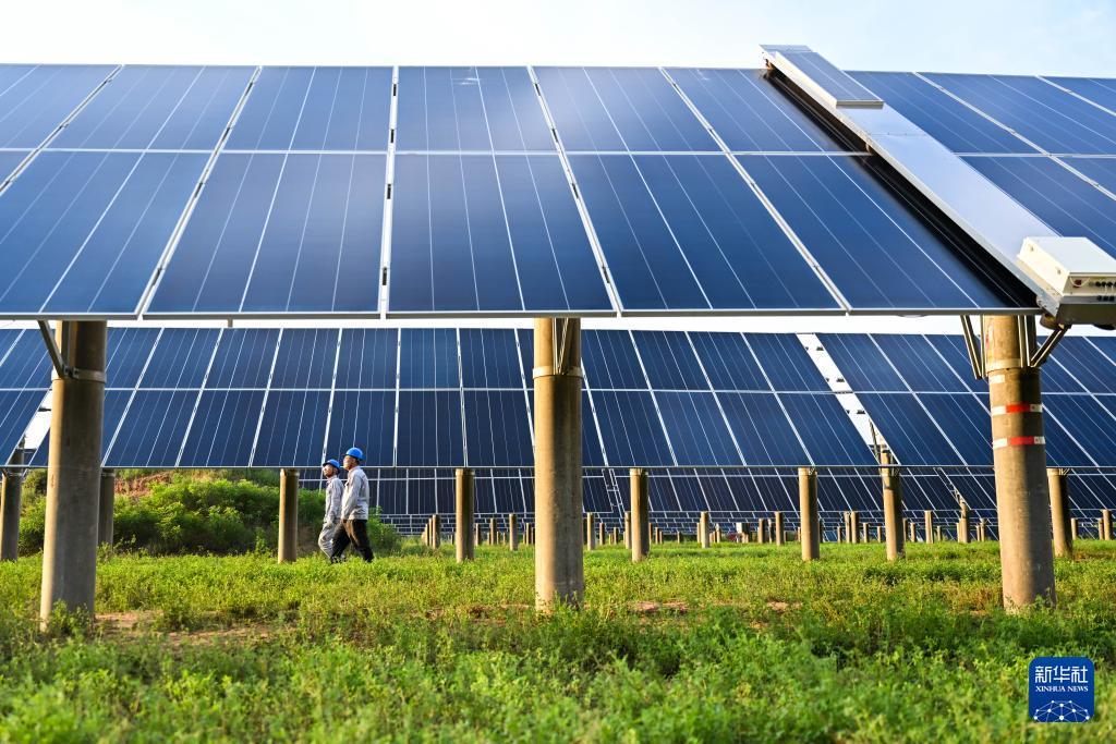 工人在天驕綠能50萬千瓦采煤沉陷區(qū)生態(tài)治理光伏發(fā)電示范項(xiàng)目區(qū)巡查光伏發(fā)電設(shè)備(7月30日攝)。