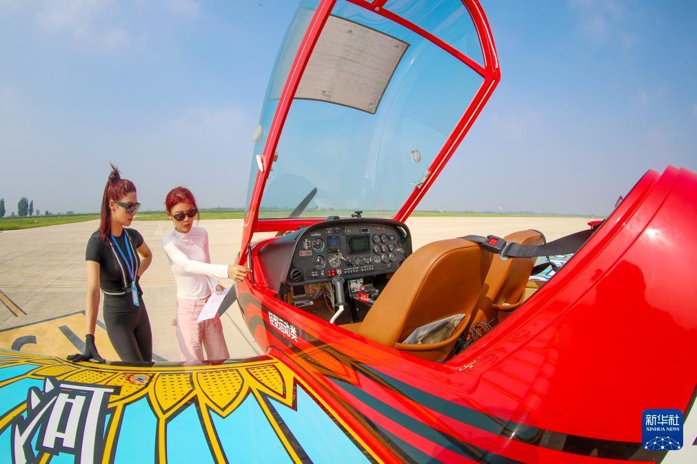 8月24日,在位于山東萊西市店埠鎮(zhèn)的青島萊西通航產(chǎn)業(yè)園,飛行教員梁婷婷(右)和飛行學(xué)員陳瑩瑩做航前繞機(jī)檢查。