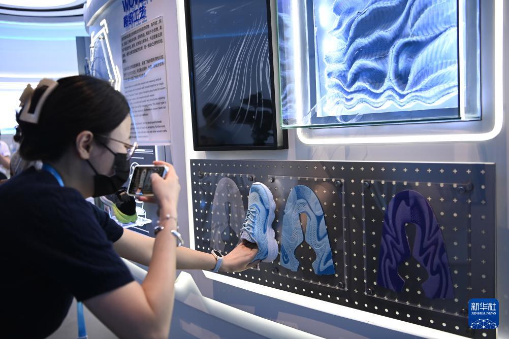 8月20日,參觀者在信泰(石獅)科技有限公司拍攝鞋面梭織面料。