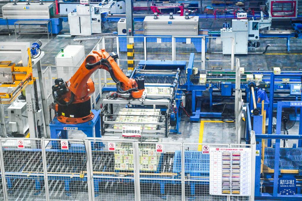 這是8月19日在福建盼盼食品集團(tuán)5G智慧工廠拍攝的飲料產(chǎn)品自動(dòng)包裝生產(chǎn)線。