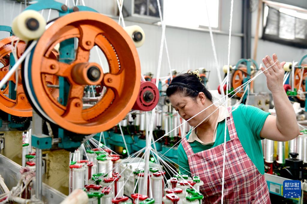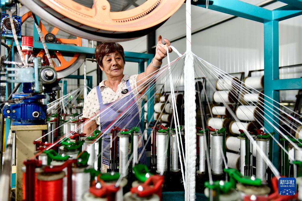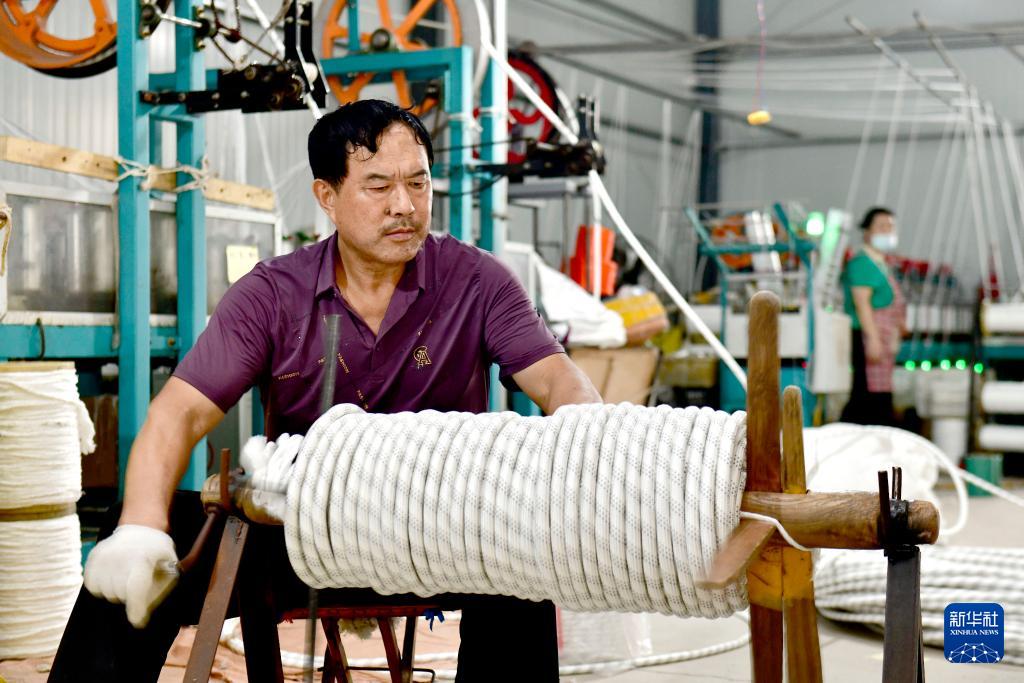 8月27日,在濱州市惠民縣李莊鎮(zhèn)一處“紅網(wǎng)工坊”,村民在加工安全繩。