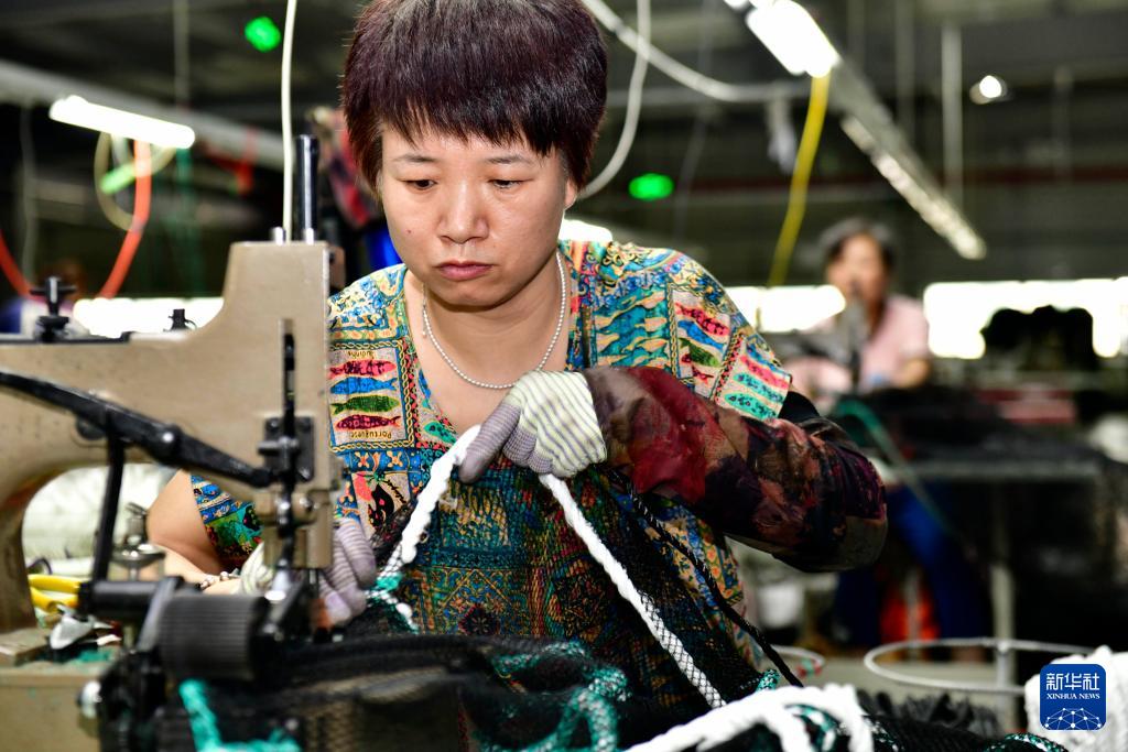 8月27日,在濱州市惠民縣李莊鎮(zhèn)一處“紅網(wǎng)工坊”,村民在加工海參養(yǎng)殖網(wǎng)。
