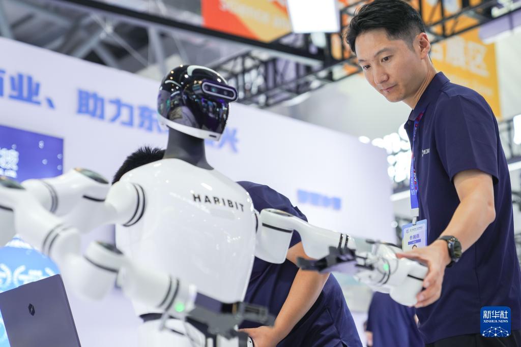 8月27日,工作人員在第十五屆中國-東北亞博覽會現(xiàn)代化產(chǎn)業(yè)館內(nèi)調(diào)試展出的具身智能機(jī)器人產(chǎn)品。