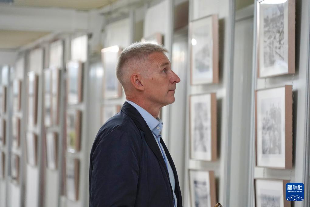 8月28日,在俄羅斯圣彼得堡,一名男子參觀紀念中國人民抗日戰(zhàn)爭暨世界反法西斯戰(zhàn)爭勝利80周年圖片展。