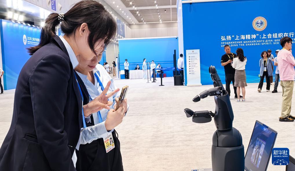 8月30日,兩名女士在2025年上海合作組織峰會新聞中心與機(jī)器人靈巧手互動。該機(jī)器人靈巧手具有超高自由度和多維觸覺精細(xì)力控。