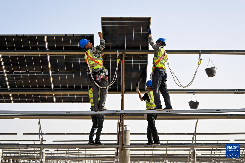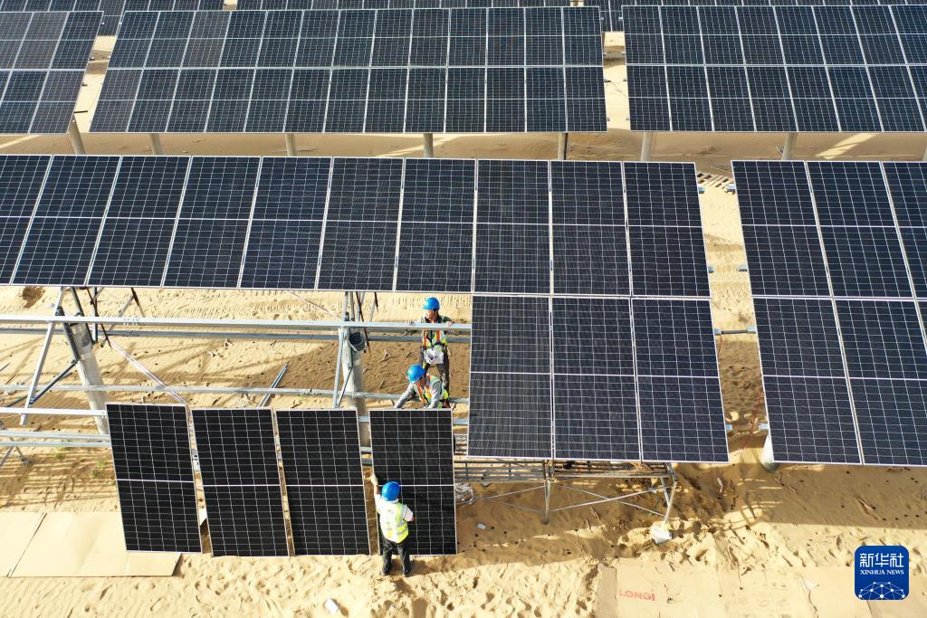工人在庫布其沙漠里的杭錦旗朔方新能源大基地安裝光伏板(9月2日攝)。
