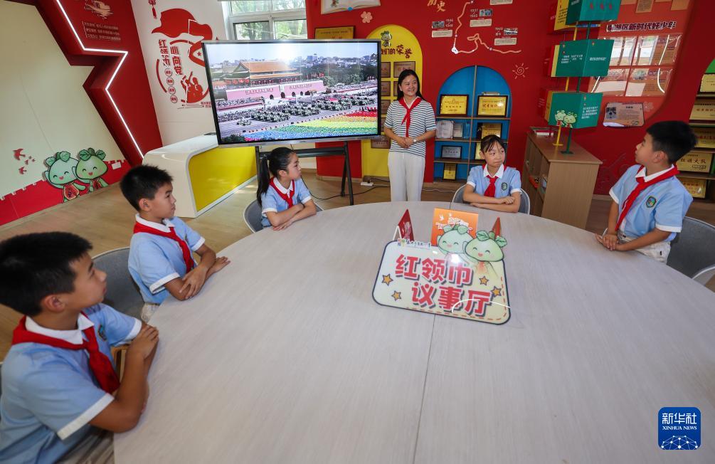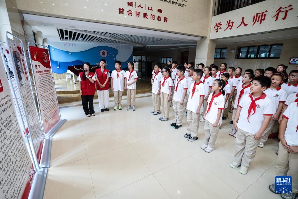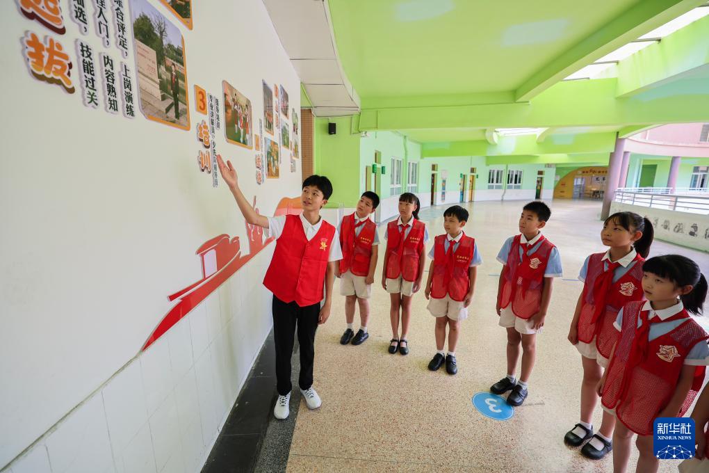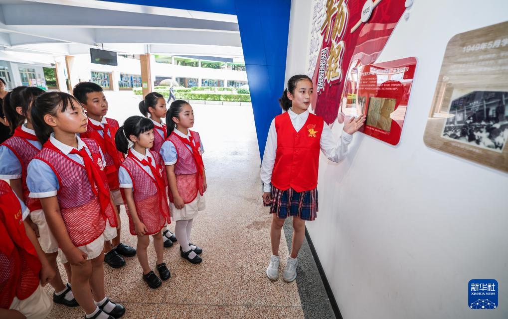 9月4日,在嘉興市實驗小學校史連廊間,全國優(yōu)秀少先隊員王希然(右一)為新一批紅船小講解講述學校的百年校史,堅定“講好學校故事、講好國家故事”的使命擔當。