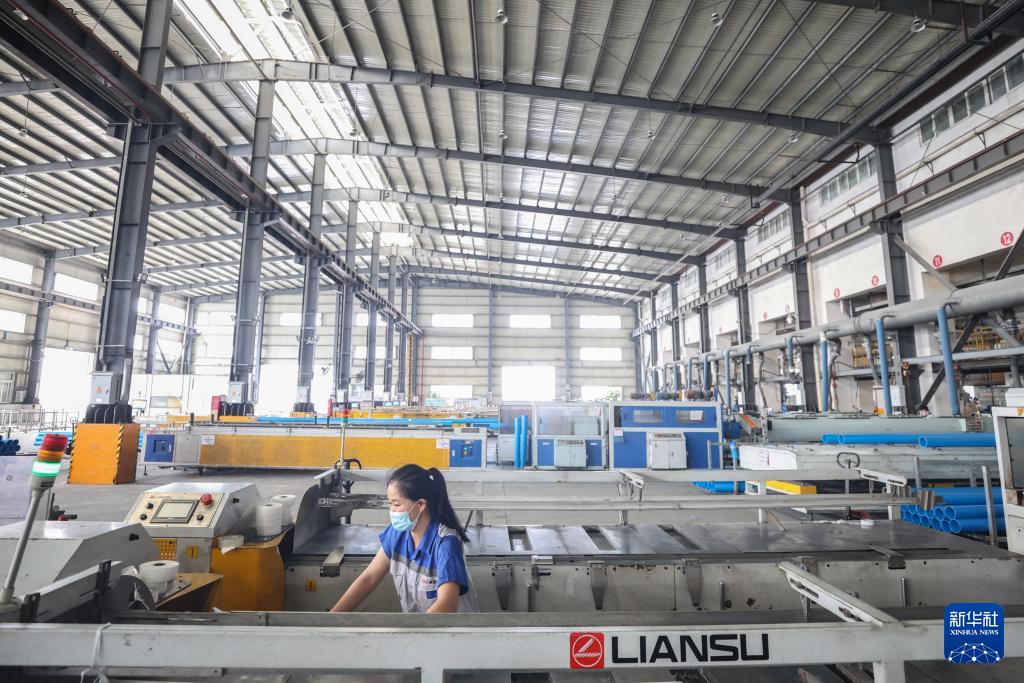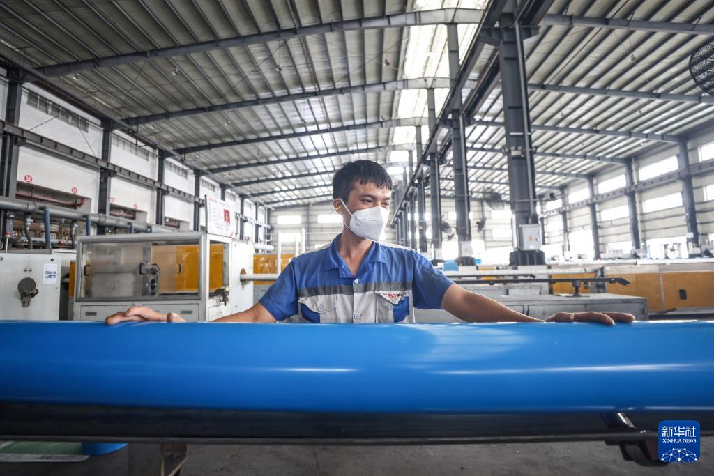 9月4日,海南聯(lián)塑科技實業(yè)有限公司的工作人員在查看生產(chǎn)線運轉(zhuǎn)情況。