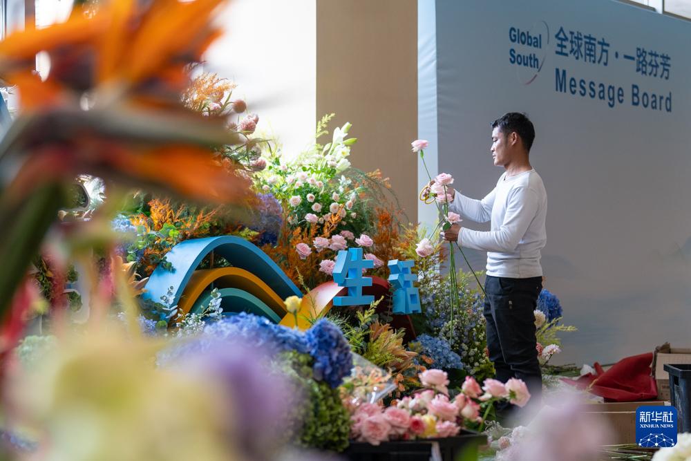 9月5日,工作人員在2025“全球南方”媒體智庫(kù)高端論壇開幕式舉辦地布置花卉裝飾。