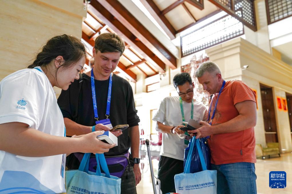 9月5日,出席2025“全球南方”媒體智庫(kù)高端論壇的代表(右一)在信息服務(wù)臺(tái)前咨詢。