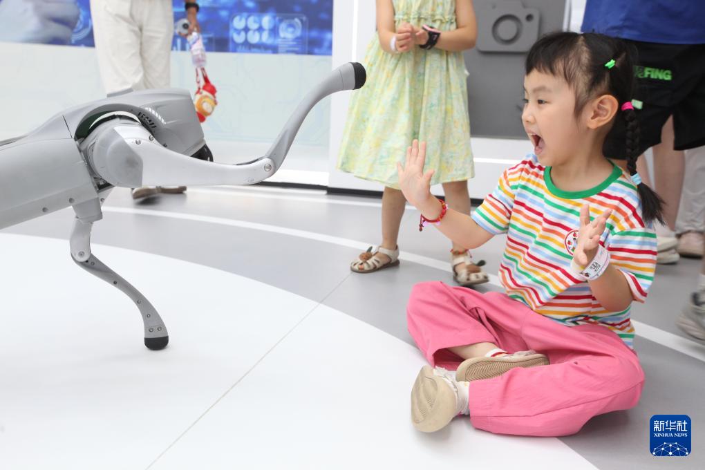 9月7日,在位于江蘇省徐州市云龍區(qū)的一家科學探索館,小朋友與機器狗互動。