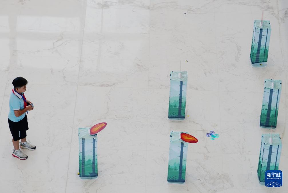 9月7日,2025年河北省石家莊市“全國科普月”科學教育實踐活動在欒城區(qū)航空中心舉行,小朋友參加無人機“滅火”賽。
