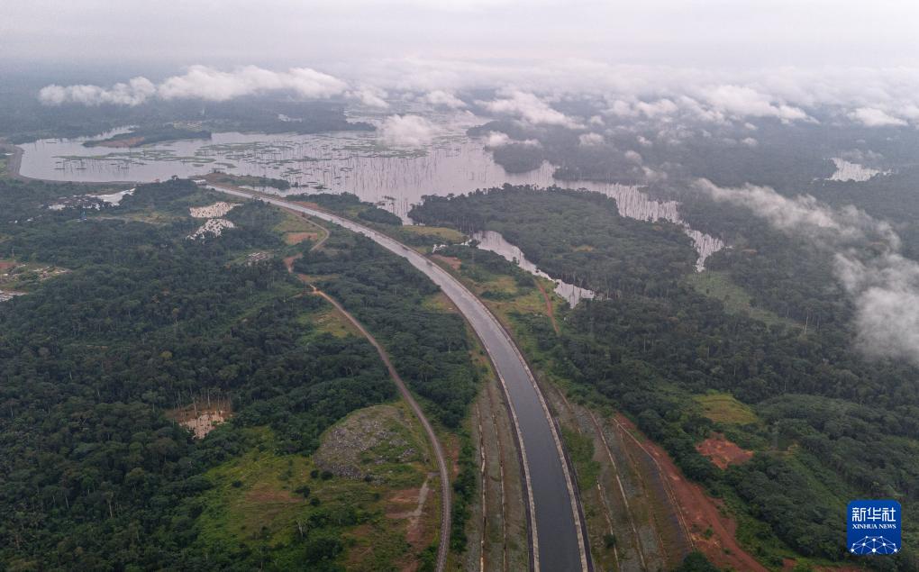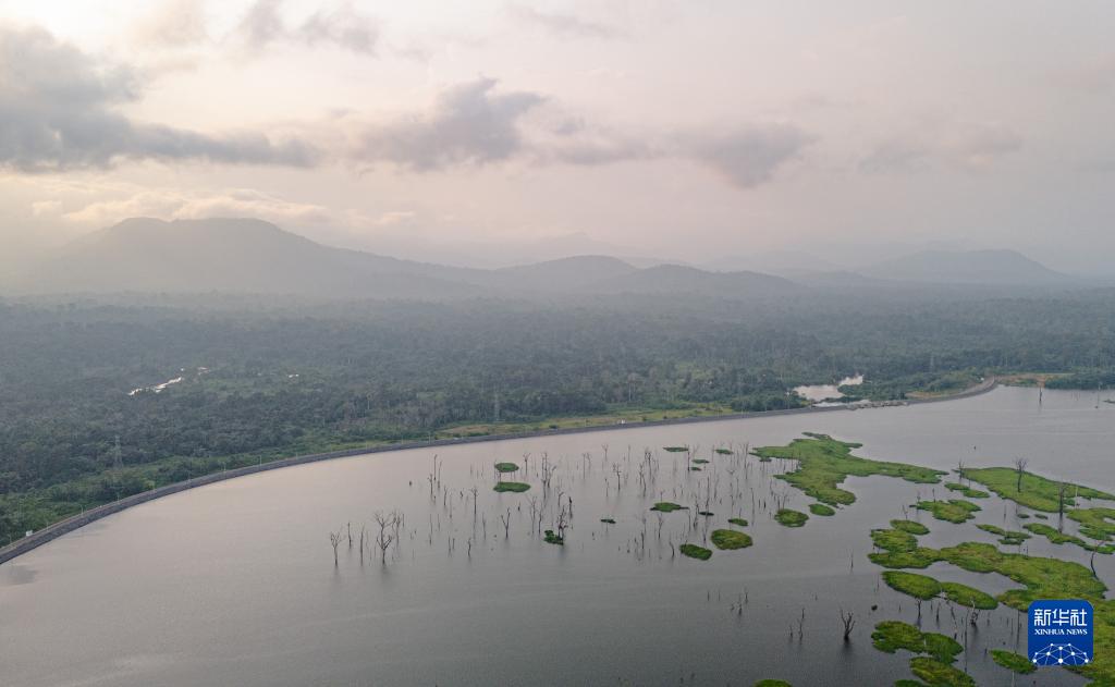 這是在喀麥隆南部大區(qū)拍攝的曼維萊水電站庫區(qū)(無人機照片,6月29日攝)。