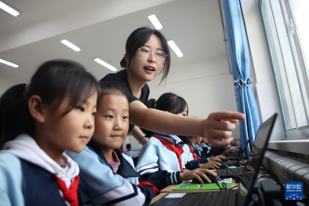 9月10日,參加活動(dòng)的聯(lián)想志愿者王智穎(左三)在鹽川學(xué)校再生電腦教室里給孩子們講解AI知識(shí)。