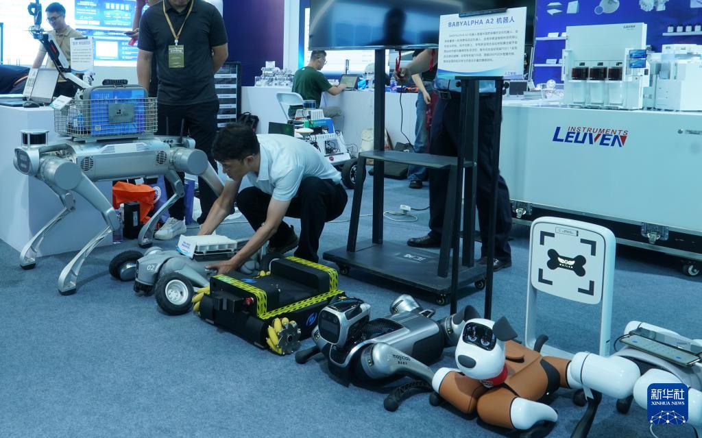 9月11日,工作人員在大會現(xiàn)場擺放機器人。