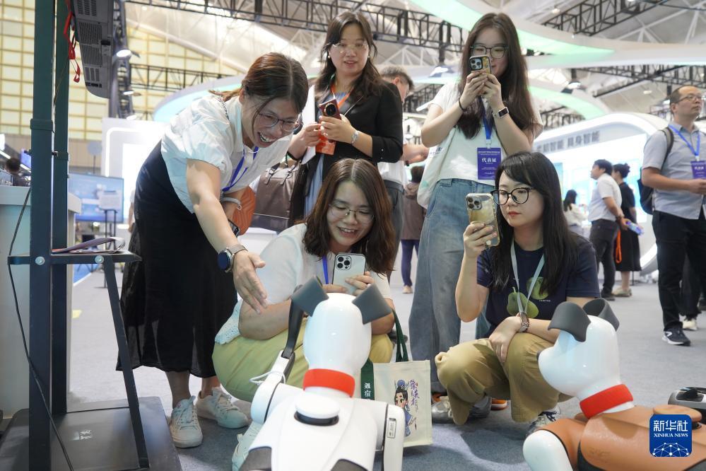 9月11日,參觀者在江蘇產(chǎn)學(xué)研合作對接大會上和BABYALPHA A2機器人互動。