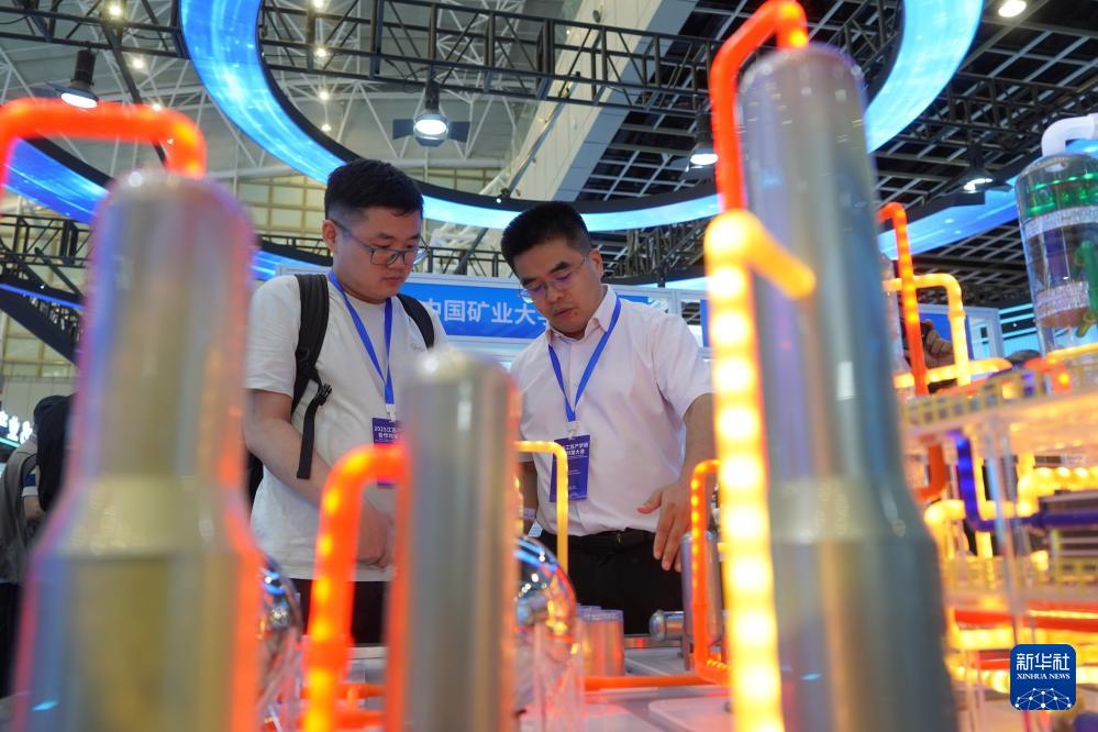 9月11日,工作人員(右)在二氧化碳捕集、利用與封存技術(shù)動態(tài)演示模型展位前為參觀者講解。