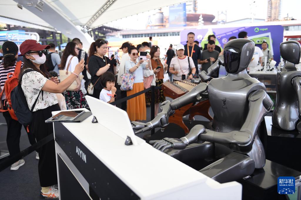 9月11日,參展者在服貿會拍攝彈鋼琴的人形機器人。