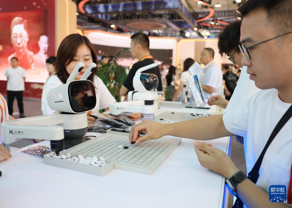 9月11日,一款下棋機器人在文旅服務專題展區(qū)與參觀者對弈。