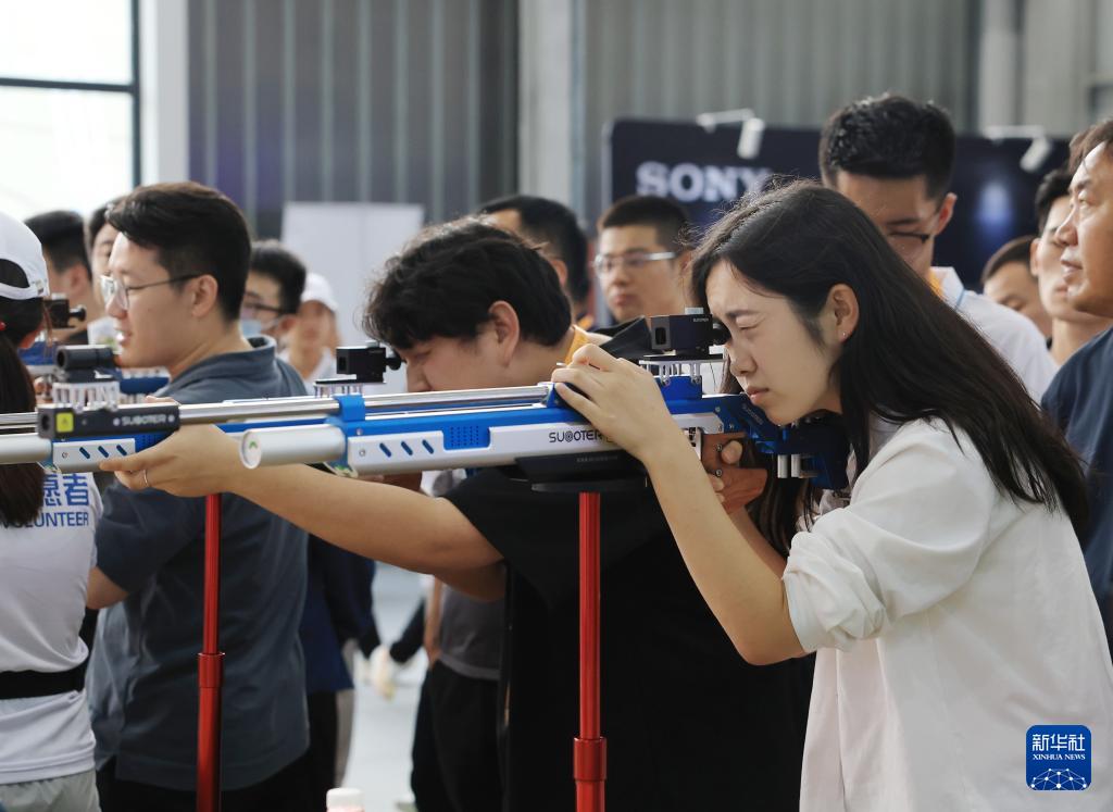 9月11日,參觀者在體育服務專題展區(qū)體驗激光射擊。