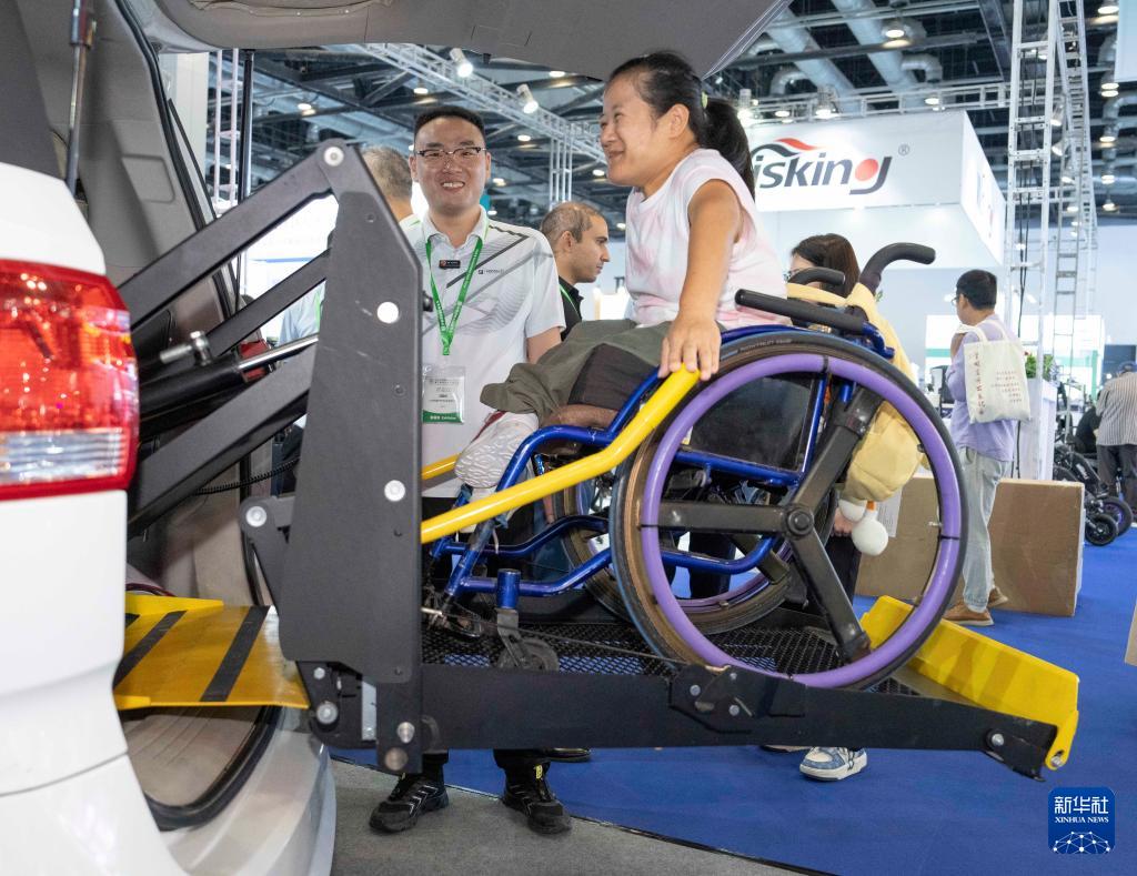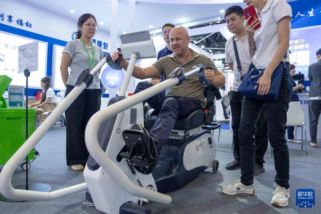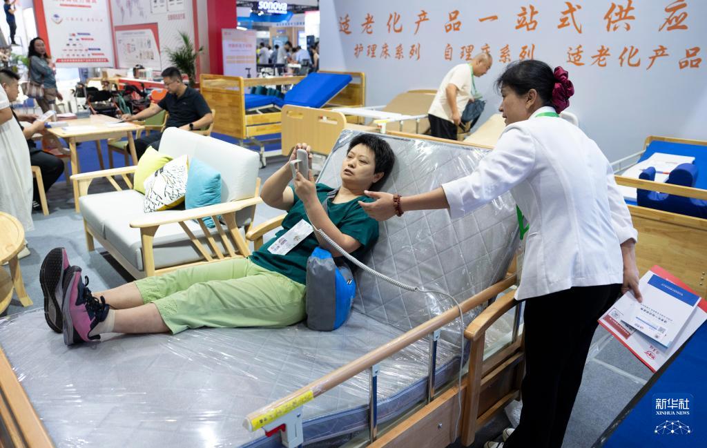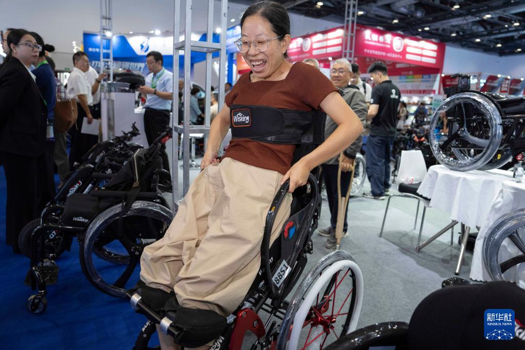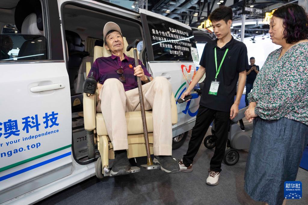 9月12日,參觀者在明澳科技展臺(tái)體驗(yàn)分離式福祉座椅。