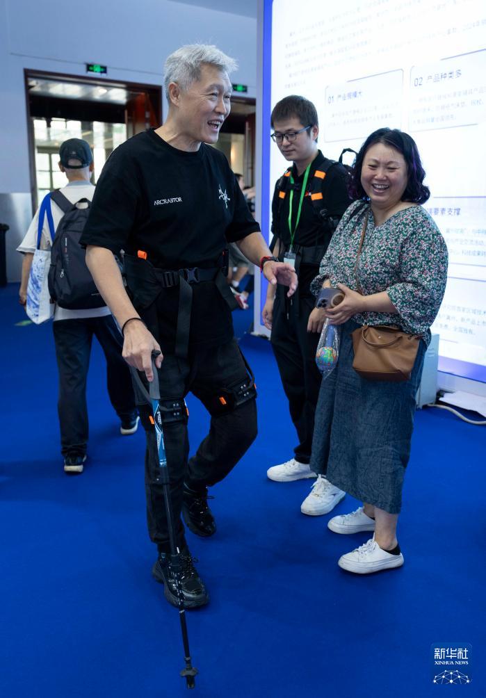 9月12日,參觀者在大灣區(qū)輔助器具創(chuàng)新中心展臺(tái)體驗(yàn)行走助力機(jī)器人。
