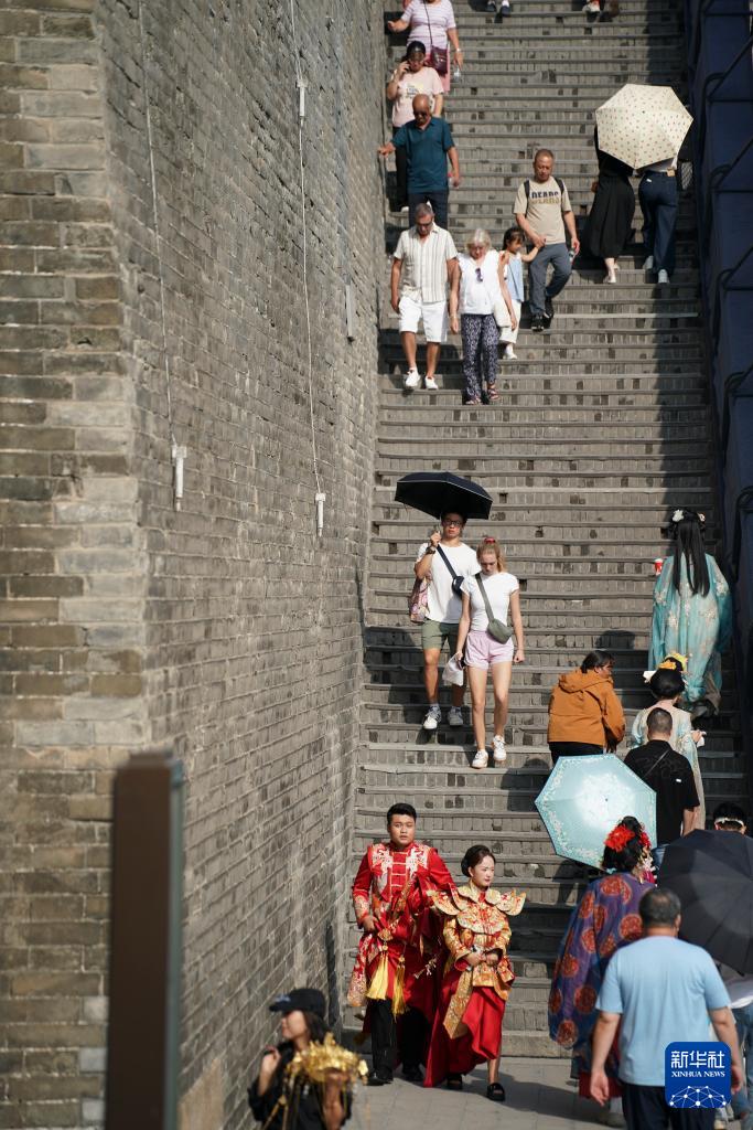 9月12日,游客在西安城墻永寧門內(nèi)游覽,左側(cè)城墻上布設著墻體裂縫監(jiān)測儀。