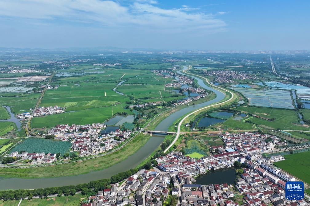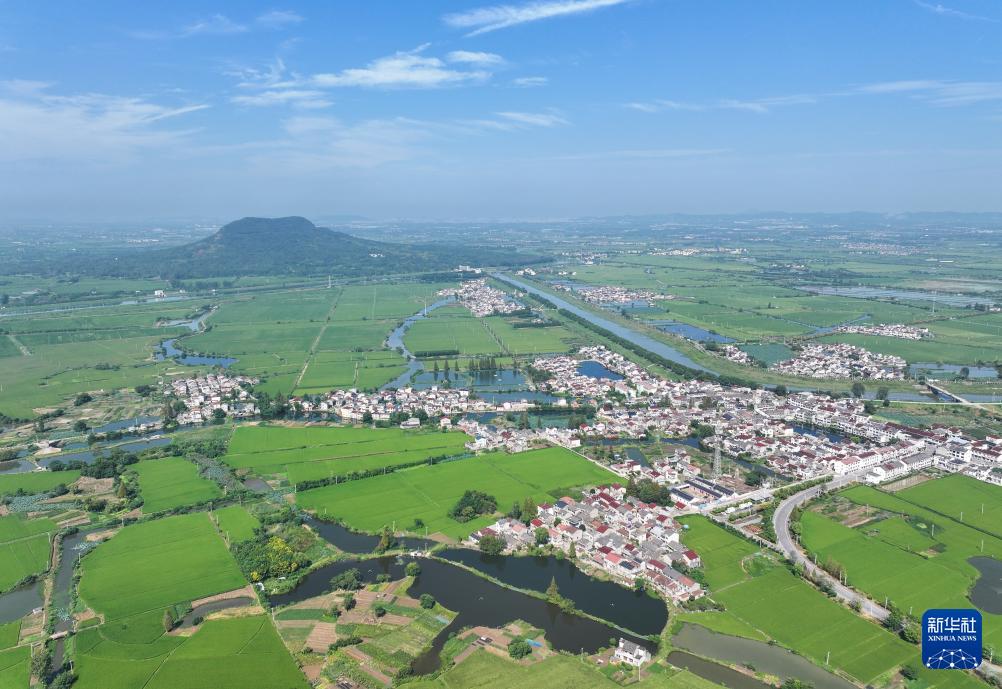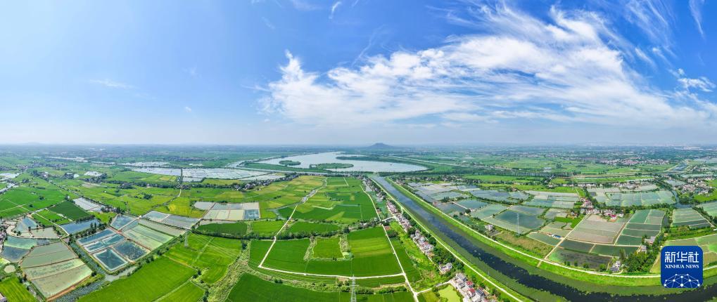 9月15日拍攝的句容赤山湖及周邊農(nóng)田(無人機全景照片)。