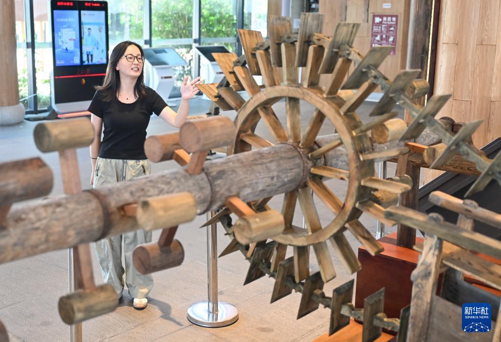 9月15日,在赤山湖灌溉工程展示館,工作人員介紹龍骨水車。