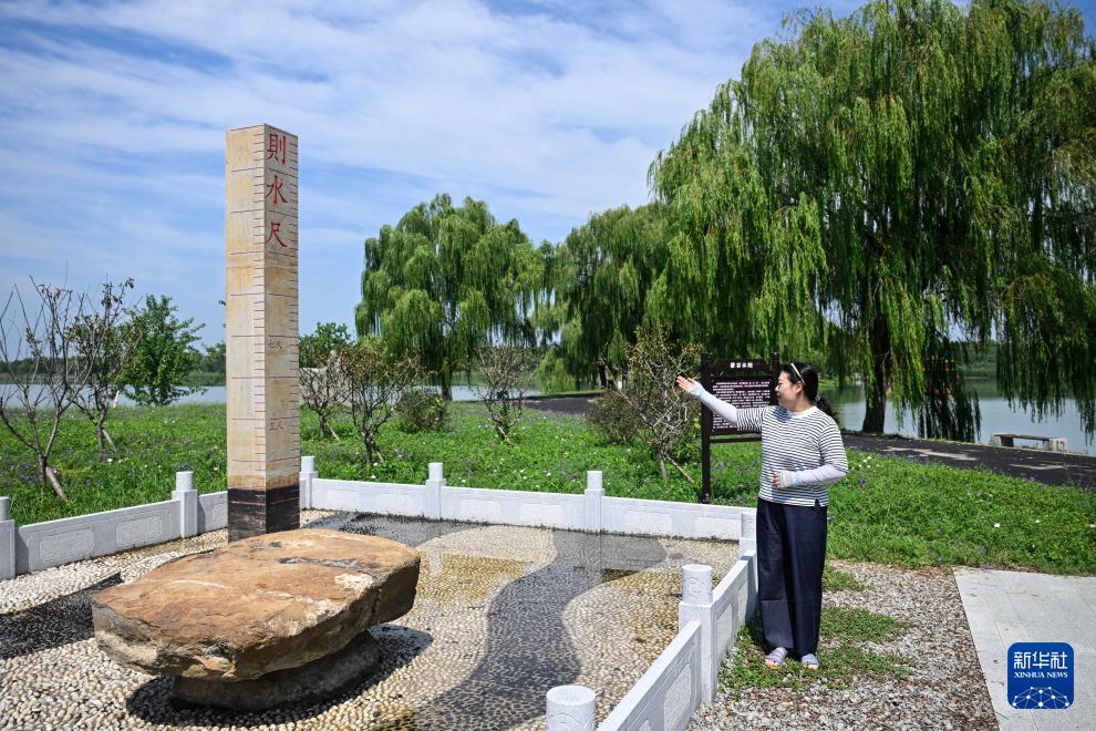 9月15日,在赤山湖國家濕地公園,工作人員介紹磐石水則。