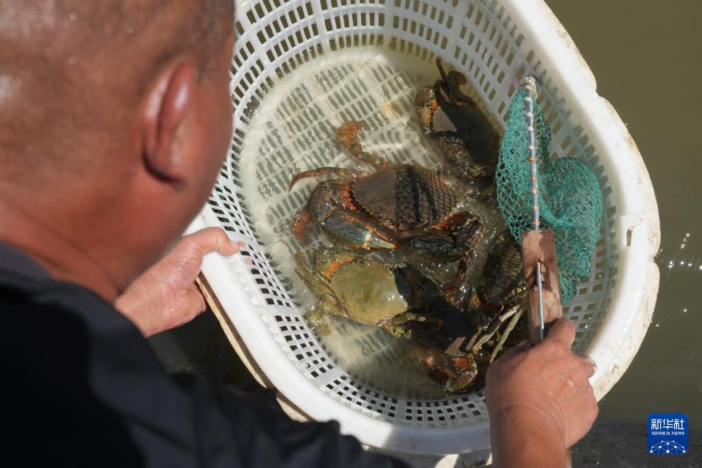 9月16日,在浙江省三門縣浦壩港鎮(zhèn)一處蟹塘,養(yǎng)殖戶在捕撈成熟青蟹。