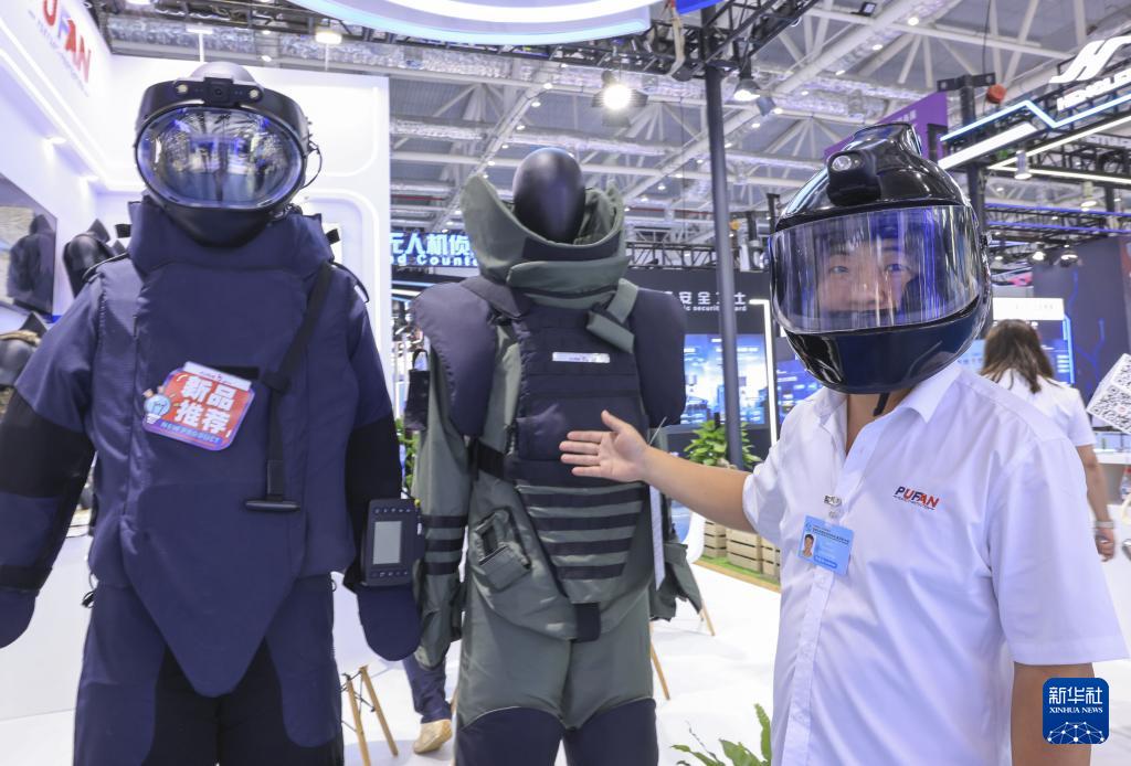 9月16日,在第二屆公共安全科技裝備展現(xiàn)場,工作人員介紹新款排爆服。