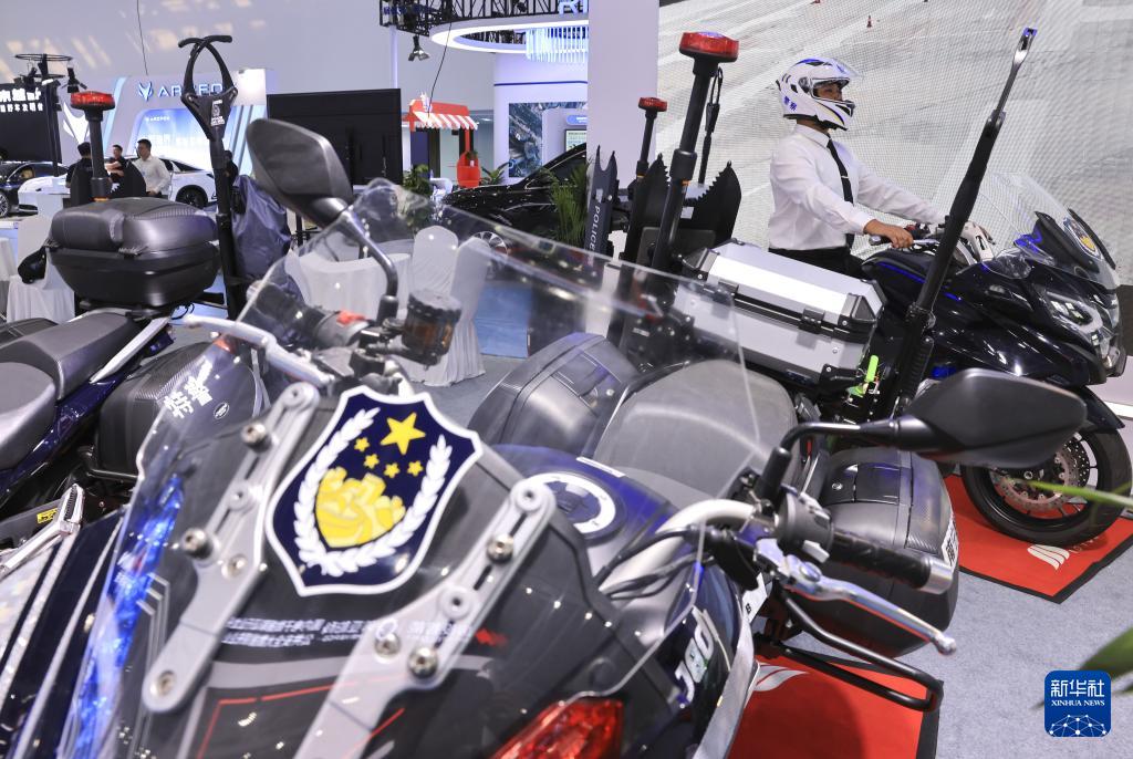 9月16日,在第二屆公共安全科技裝備展現(xiàn)場,工作人員展示警用摩托車。