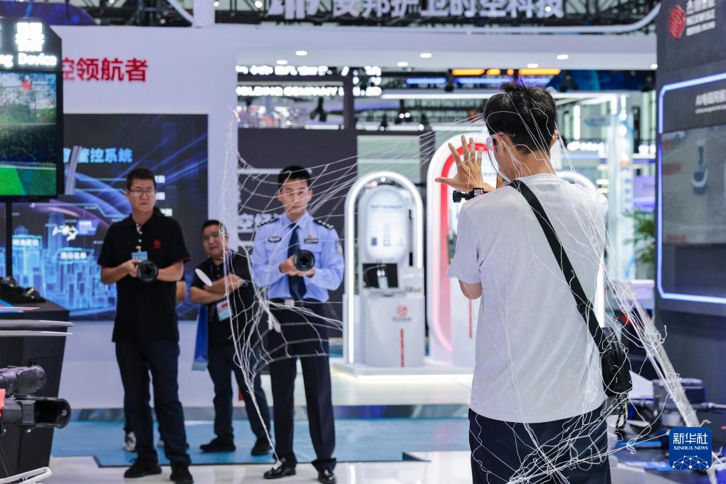 9月16日,在第二屆公共安全科技裝備展現(xiàn)場,工作人員在展示AI電磁網(wǎng)捕產(chǎn)品。