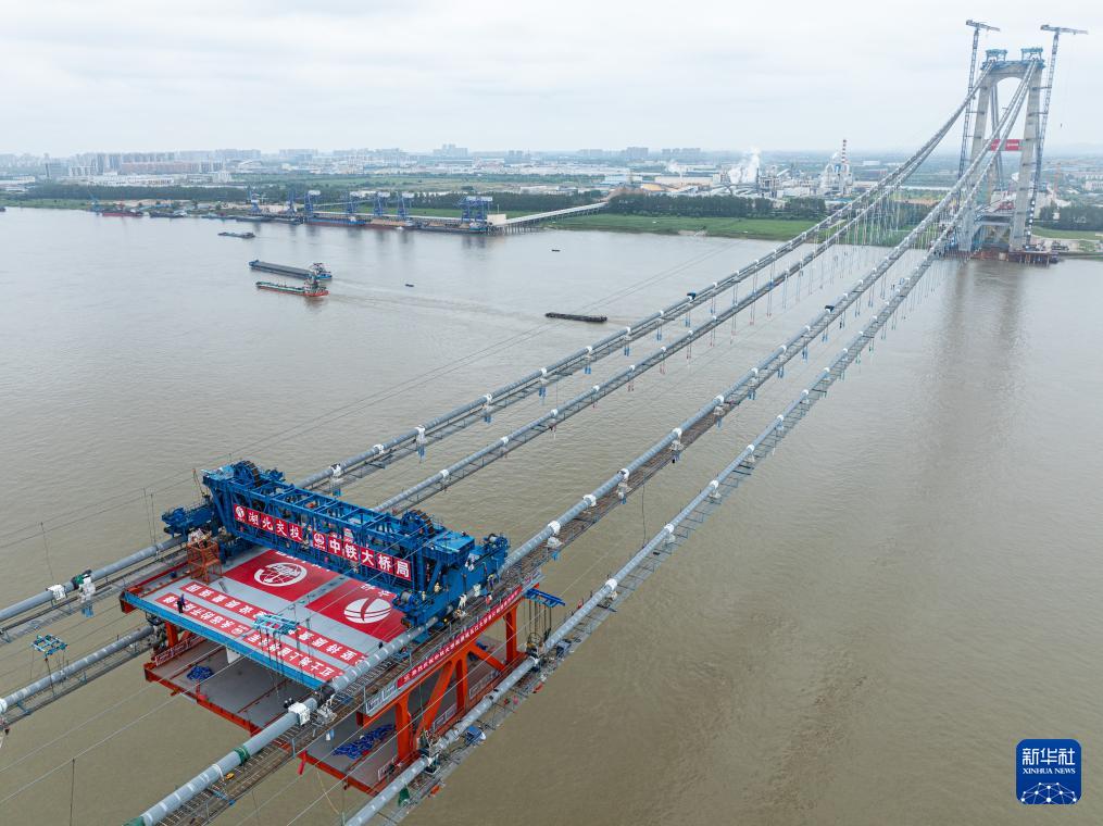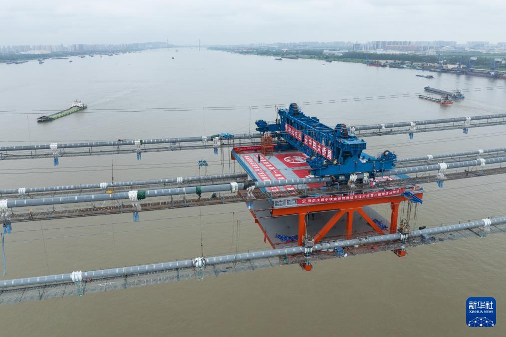 9月20日拍攝的燕磯長(zhǎng)江大橋主跨鋼梁架設(shè)施工現(xiàn)場(chǎng)(無(wú)人機(jī)照片)。