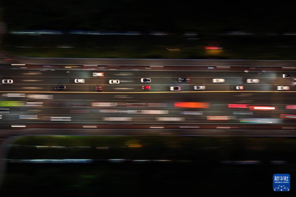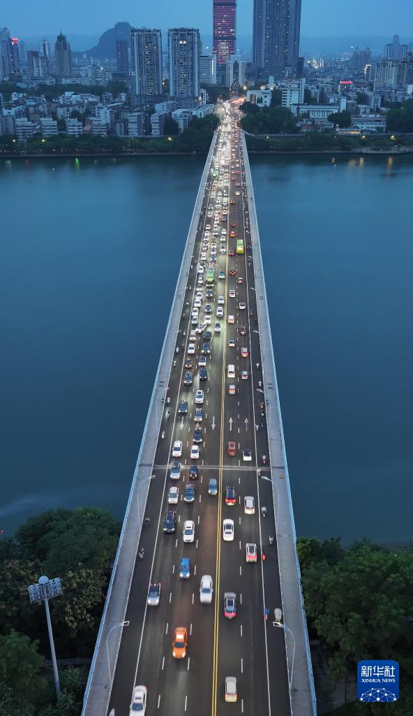 汽車行駛在廣西柳州市文昌大橋上,其中部分為柳州產(chǎn)的新能源汽車(9月8日攝,無人機照片)。