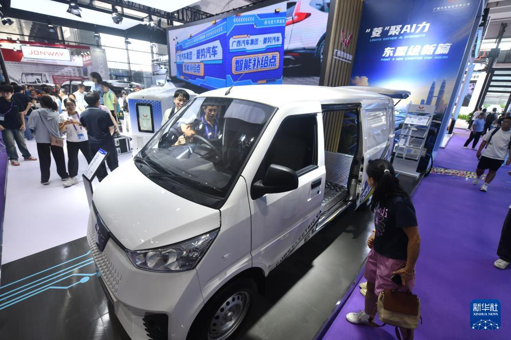 在廣西南寧國際會展中心,參觀者了解一款柳州產(chǎn)的純電動廂式物流車(9月19日攝)。