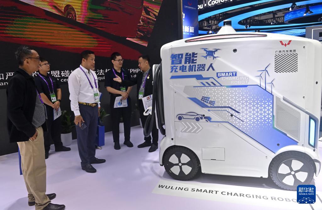 在廣西南寧國際會展中心,參觀者了解一款柳州產(chǎn)的智能充電機器人(9月19日攝)。
