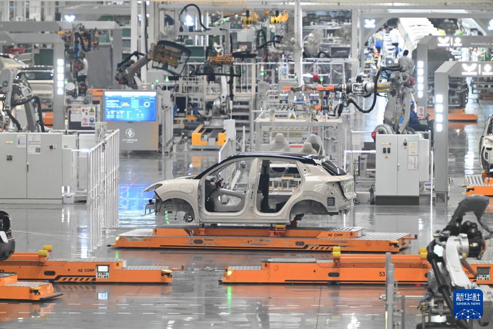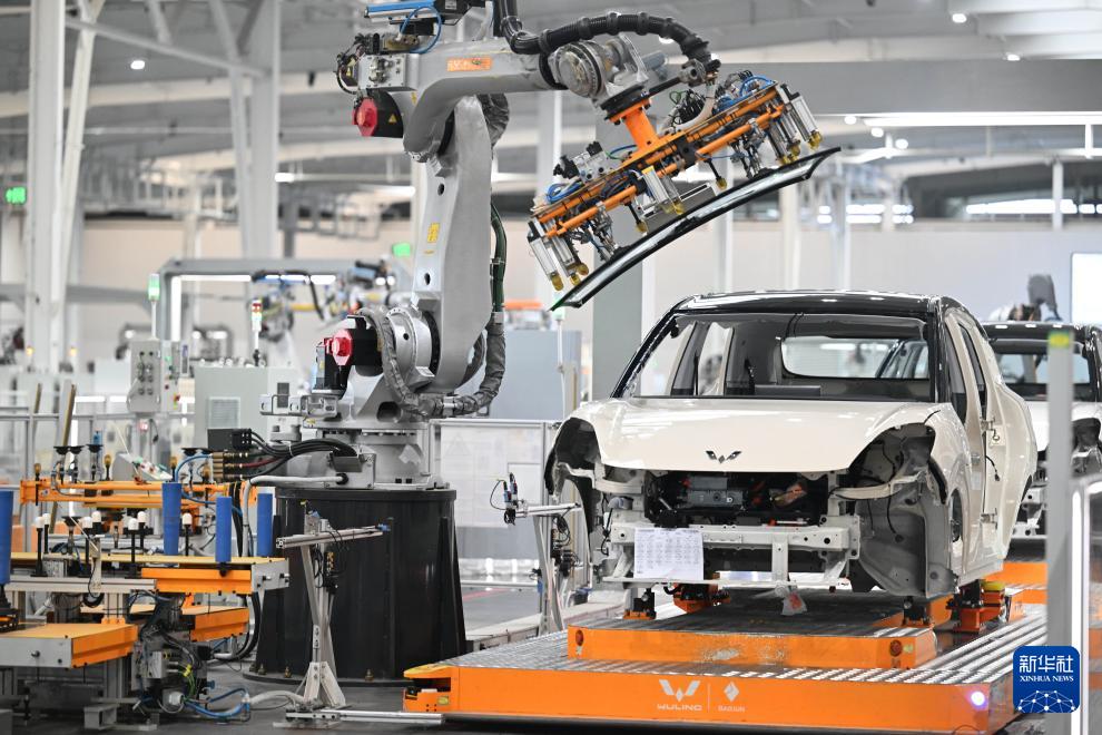 在廣西柳州汽車城,上汽通用五菱“島式”精益智造工廠里忙碌的自動化生產(chǎn)線(9月9日攝)。