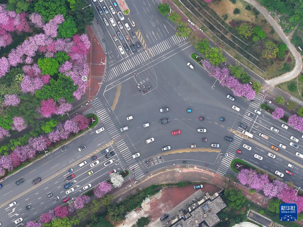 汽車行駛在廣西柳州市學(xué)院路上,其中部分為柳州產(chǎn)的新能源汽車(4月8日攝,無人機照片)。