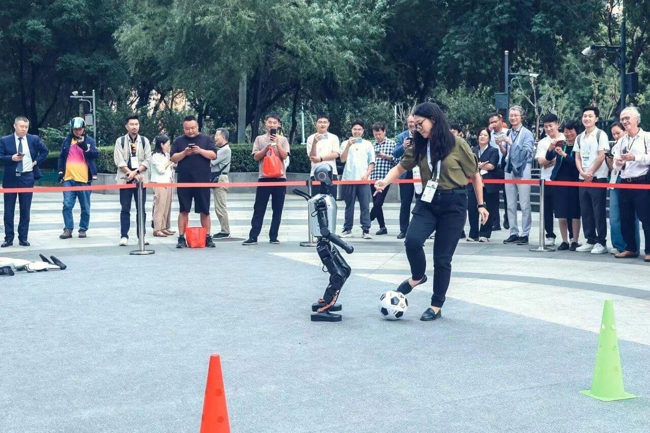 與加速進(jìn)化TI機(jī)器人來(lái)一場(chǎng)1V1足球?qū)官悾龑?dǎo)機(jī)器狗躲避路障走出S形線路,一次次與機(jī)器人揮手致意親密接觸,眼神里閃爍著好奇與驚嘆……