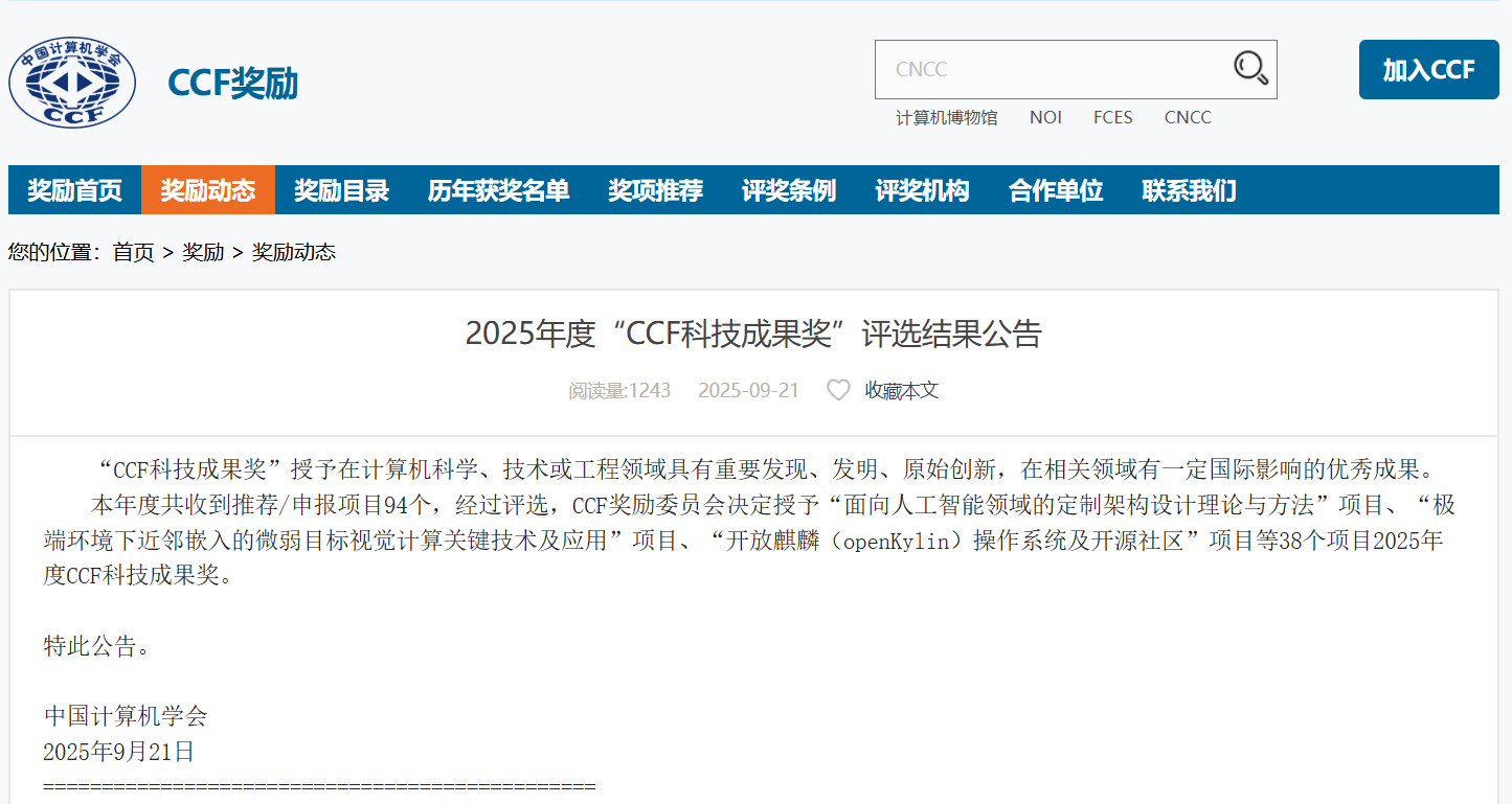 本報(bào)訊 (記者 李洋)近日,中國(guó)計(jì)算機(jī)學(xué)會(huì)(CCF)揭曉2025年度“CCF 科技成果獎(jiǎng)”評(píng)選結(jié)果,38個(gè)項(xiàng)目分獲自然科學(xué)獎(jiǎng)、技術(shù)發(fā)明獎(jiǎng)和科技進(jìn)步獎(jiǎng)。其中,“開(kāi)放麒麟(openKylin)操作系統(tǒng)及開(kāi)源社區(qū)”項(xiàng)目憑借在核心技術(shù)突破與產(chǎn)業(yè)落地中的突出貢獻(xiàn),斬獲代表該獎(jiǎng)項(xiàng)最高榮譽(yù)的科技進(jìn)步特等獎(jiǎng)。openKylin作為中國(guó)“十四五”期間孕育的開(kāi)源力量,由麒麟軟件發(fā)起并捐贈(zèng),由開(kāi)放原子開(kāi)源基金會(huì)運(yùn)營(yíng),致力于打造全球領(lǐng)先的智能桌面操作系統(tǒng)開(kāi)源根社區(qū)。
