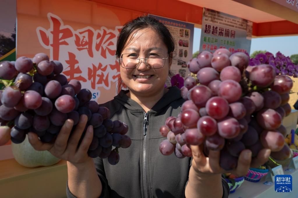 9月23日,農(nóng)戶在定制農(nóng)業(yè)集中展銷區(qū)展示豐收的葡萄。