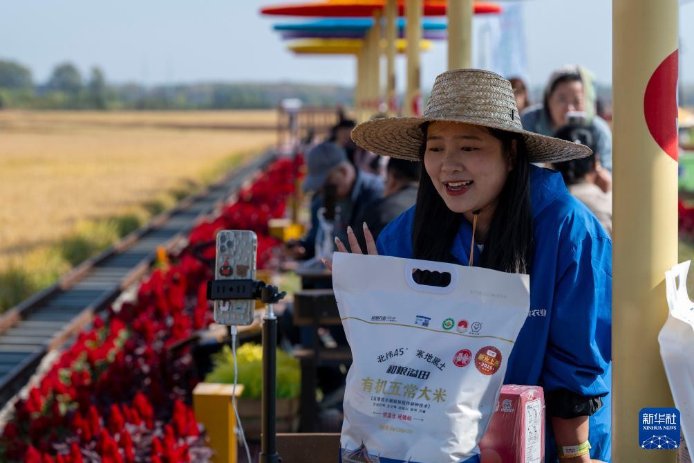 9月23日,網(wǎng)絡(luò)主播在北大荒農(nóng)墾集團(tuán)閆家崗農(nóng)場(chǎng)稻田藝術(shù)公園內(nèi)直播。