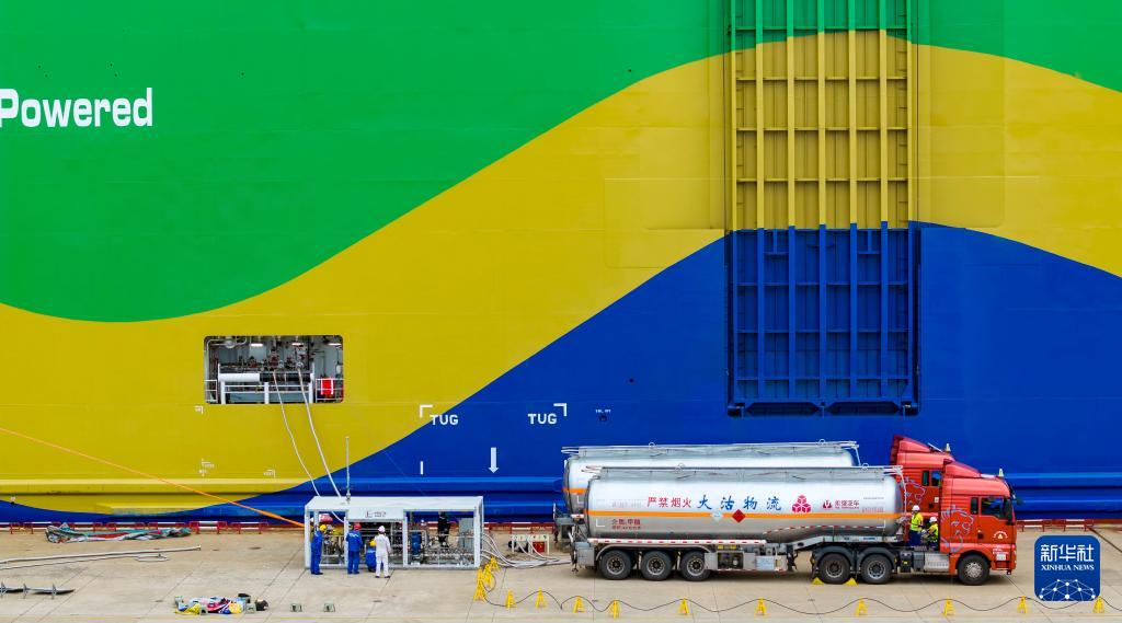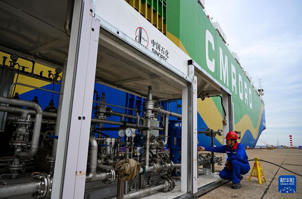 9月22日,在天津港環(huán)球滾裝碼頭,工作人員準(zhǔn)備進(jìn)行甲醇加注作業(yè)。